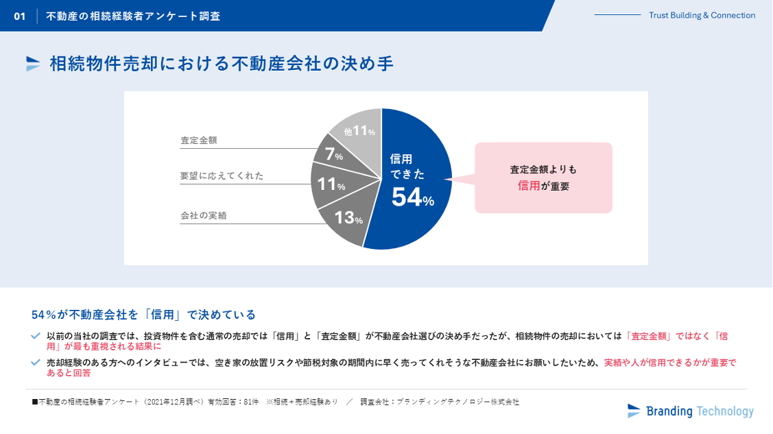 これまでのアンケート調査では、相続物件の売却依頼の大きな決定要因として「企業や担当者への信用力」が54%という高い比率で回答を得ました。売り主は、ホームページや、他のメディア、担当者などの企業についての情報に接触していくなかで、その企業は「本当に信頼できるのか?」が一つの大きな指針と考えております。今回のサービスでは、売主からの信頼を効果的に獲得していく方法をパッケージに致しました。