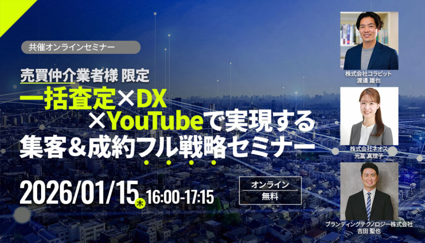 本セミナーでは、反響後追客/営業DX/YouTube信頼構築の3つの領域で実績を持つ3社が集結し、現場で即実践できる最新の成功ノウハウを徹底解説します。